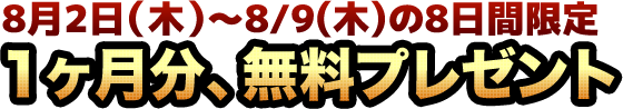 8月2日(木)から8月9日(木)26:00までの8日間は1ヶ月分無料で手に入ります。